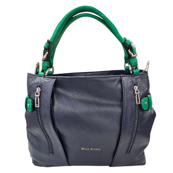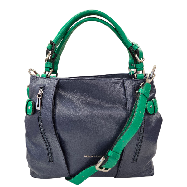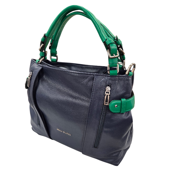 Home Handbags New Handbag Arrivals Bella Bianca Leather Handbag 2 Zip Compartment Navy/Green – D391