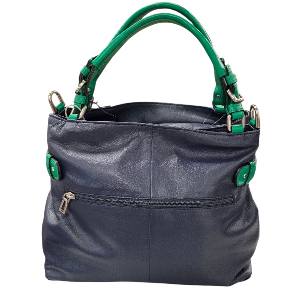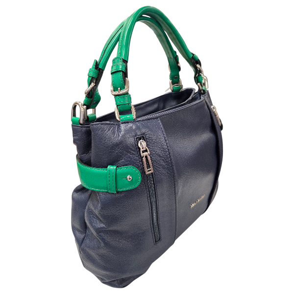 Bella Bianca Leather Handbag 2 Zip Compartment Navy/Green - D391