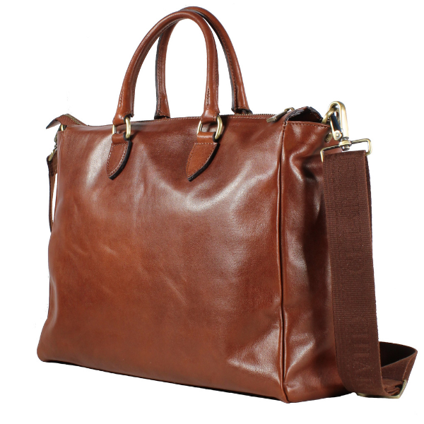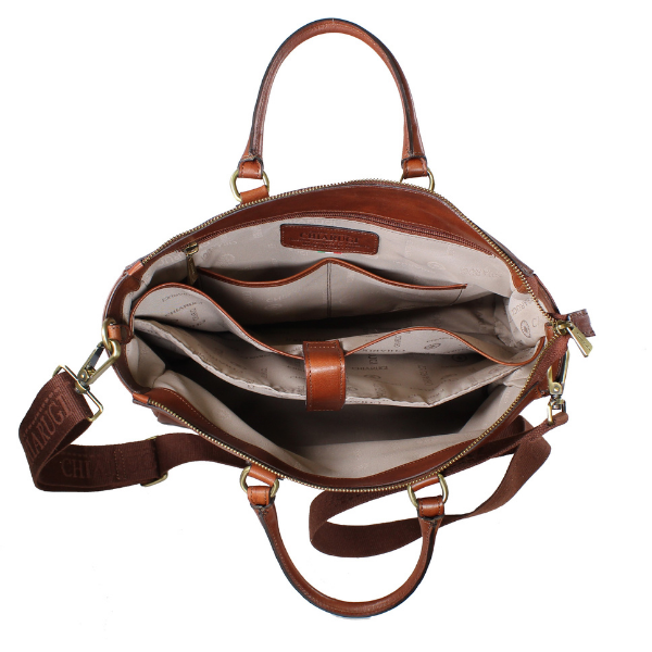 Handmade in Florence, Italy, Chiarugi boasts a long tradition of producing fine leather bags, constructed with the care of artisans using Florentine leather. This beautiful handbag has gold and brass trims and has a laptop section for a 14″ laptop or 10″ tablet. It is a classy handbag that can be taken into meetings. Wear it using the short top handles or long shoulder strap. Chiarugi is exclusive to Gopals Bags & Luggage.