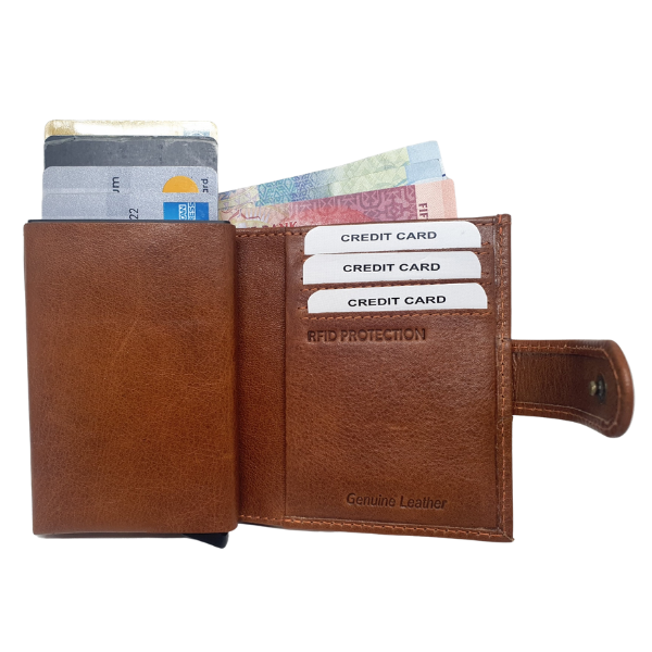 This clever card holder by Hide Culture carries 5 credit cards inside the pop up mechanism that is wrapped inside a vegetable tanned leather. Slide open the bottom clip to pop up your cards so you can easily pull out the card you need! Inside the leather, there is also space for extra credit cards, your notes and there is a photograph window to slide in your ID or licence! It is neat and ideal for those who don't want to carry a wallet all the time.