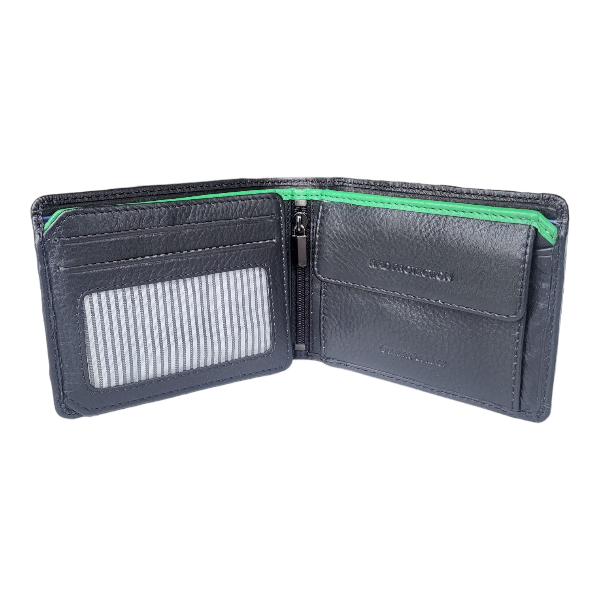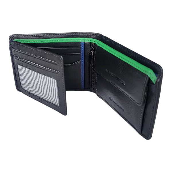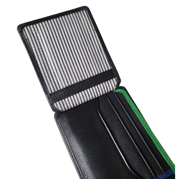 This wallet carries your notes, credit cards and coins. It has a pin-striped interior lining with inner green and blue detail. It has windows to slide in your ID, driver’s licence or family photographs and has slots to carry your notes. This wallet is RFID secure.