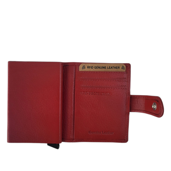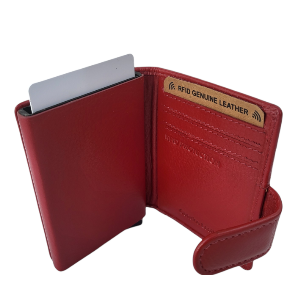 Ladies will love this striking card holder by Hide Culture! With its funky colours, it carries 5 credit cards inside the pop-up mechanism that is wrapped inside a vegetable tanned leather. Slide open the bottom clip to pop up your credit cards and easily pull out the card you need! Inside you will find space for extra credit cards and your notes as well! It is small and neat to fit inside your handbag and is RFID secure!