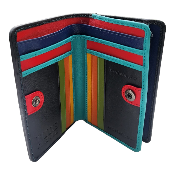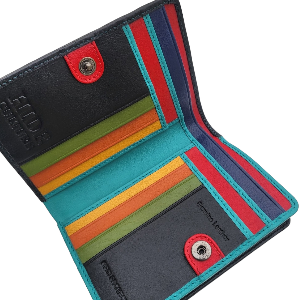 This beautiful Hide Culture small purse is made of soft Nappa leather and is striking and beautiful with its multi-colours! It has deep slots for your notes and carries 8 credit cards. There is also a coin compartment inside for your change and it is RFID secure. Hide Culture is exclusive to Gopals Bags & Luggage.