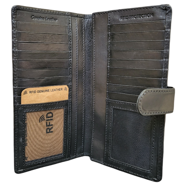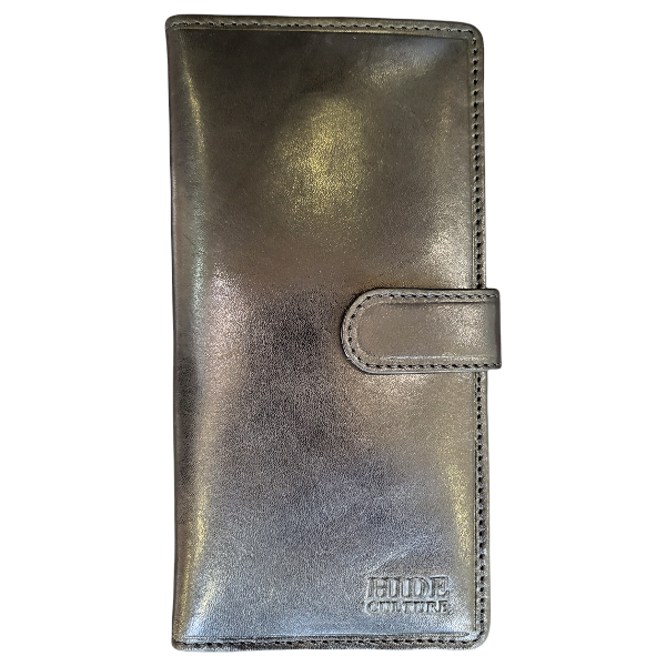A slim, unisex credit card wallet that carries 20 cards, coins and has slots for your notes. This wallet closes by a press-stud tab. This Hide Culture wallet is RFID secure.