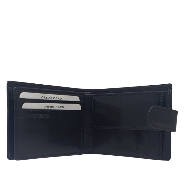 This wallet carries your notes, credit cards and coins. It takes up to 7 credit cards, has a single slot for your driver’s licence or photograph as well as a pouch for your coins. You close it by using the press-tab. This wallet is RFID secure.