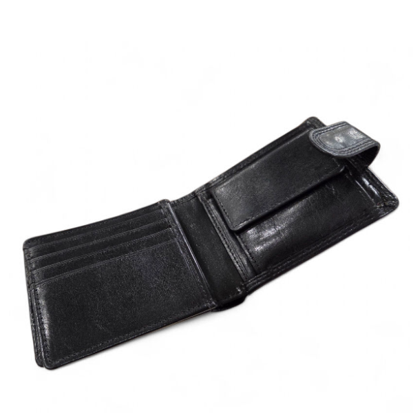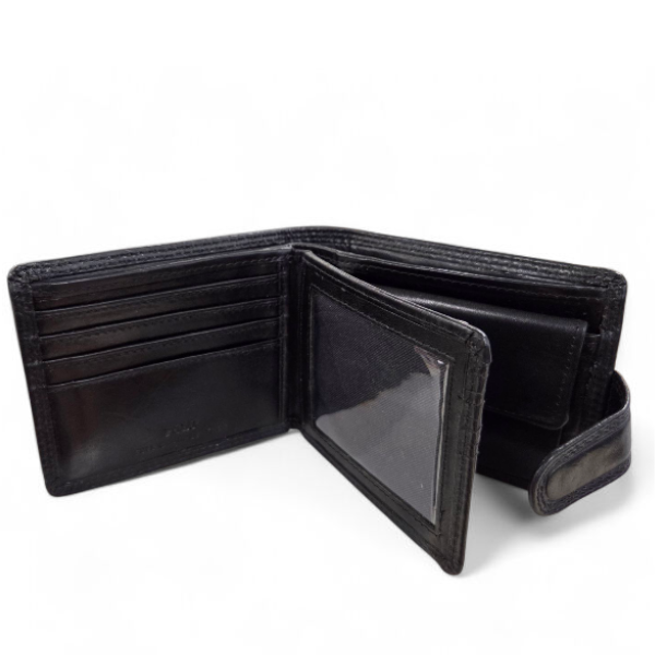 This leather trifold wallet takes 10 credit cards, has a window for your drivers licence, a compartment for your coins and 2 slots for your notes. It closes with a press-tab.
