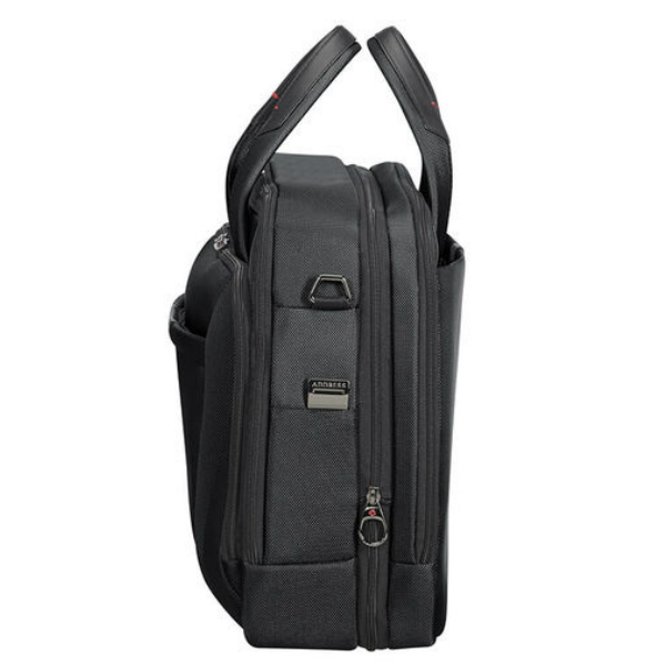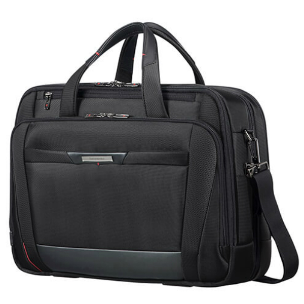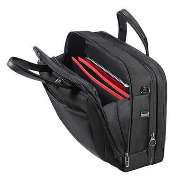 The Samsonite Pro-DLX 5 briefcase is made from an armoured nylon that has nappa leather trims and red detail to give it a smart look. The front compartment is an organizer where you would place your stationary and has a key holder for your keys. This bag has 3 zip compartments. Your work papers and files easily fit inside the first zip, in the middle you can pack extra papers or a set of clothes and in the last compartment you wil pack your 17.3″ laptop and tablet inside the padded space provided.