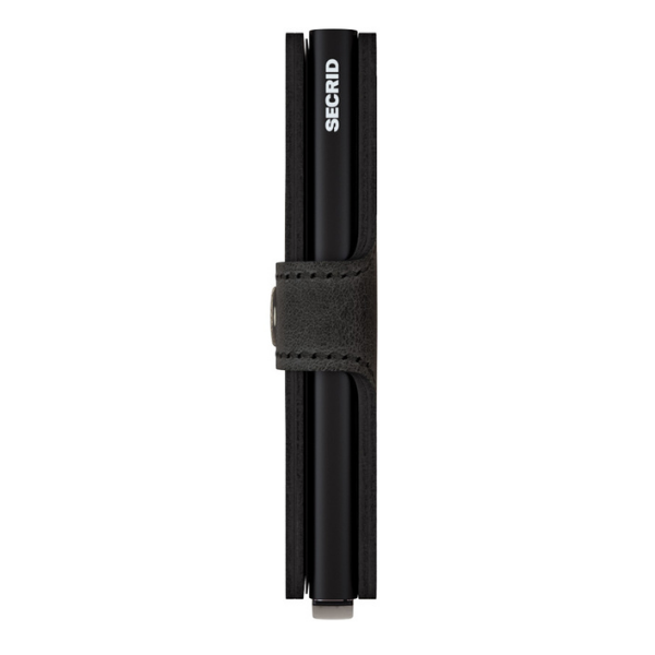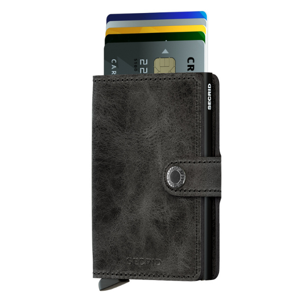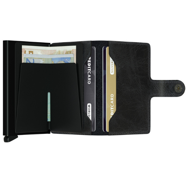 The Secrid Miniwallet is compact in size and its aluminum casing protects your cards from bending, breaking and unwanted wireless communication. Wrapped around the case is a corrected-grain leather that has an abraded surface and a wax finish to give it a stonewashed look. The wax ages over time and gives it a personalised look. The wallet carries your credit cards, notes and is slim to fit inside your trouser or coat pocket.